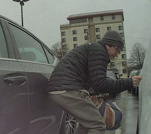 Central Bucks Regional Police allege Ritenbaugh was dressed in a gray beanie, sweatpants, a black puffer coat with a light-colored undershirt, and carrying a blue and red bag with white stripes when he vandalized the car at 9:24 a.m.