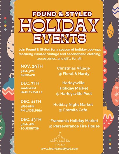 Found & Styled will be offering curated collections of vintage and secondhand clothing, accessories and gifts at various holiday markets and events across the region throughout December, including pop-ups in Skippack, Harleysville, Roxborough, and Franconia in order to help people ready for the holiday season, sustainably.