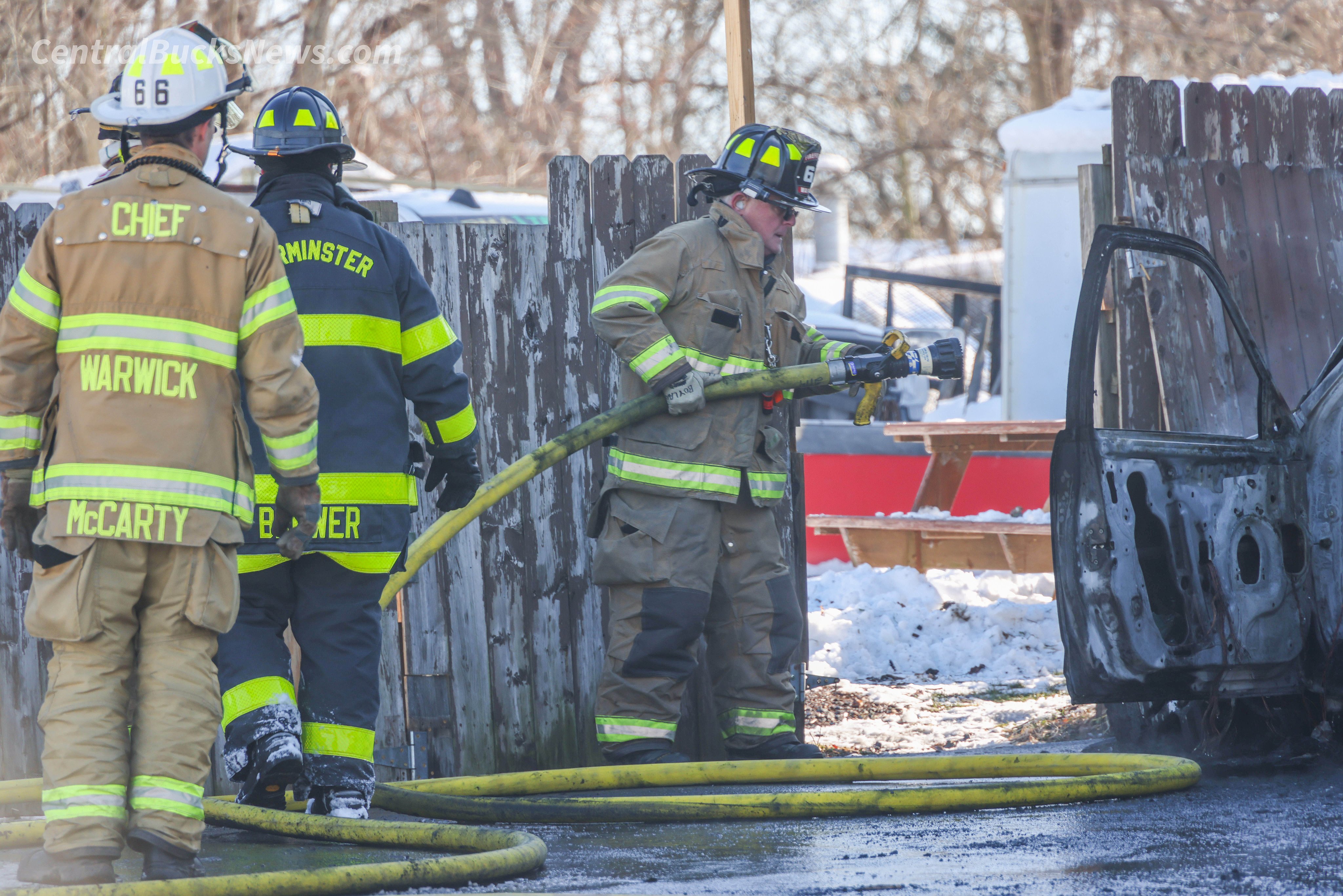 Firefighters from Warminster, Warwick and Hartsville fire companies worked together Tuesday morning to control and extinguish a fully-involved vehicle fire in a driveway before it spread to the adjacent home on the 1400 block of Old York Road in Warwick Township.