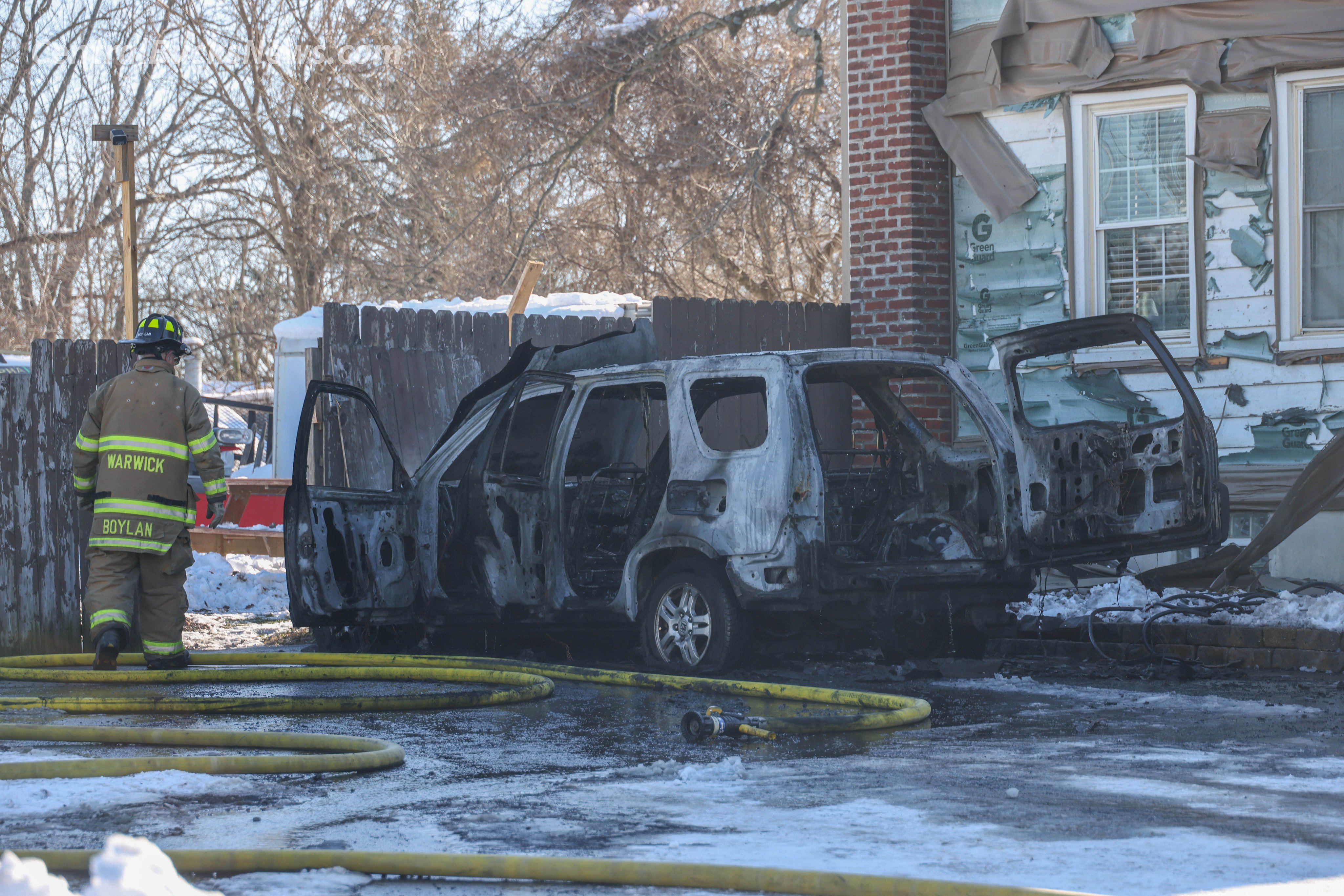 Heat from the blaze melted and damaged vinyl siding and exterior walls before fire crews extinguished it, causing minor damage. The vehicle was fully destroyed. Its make and model are unknown.