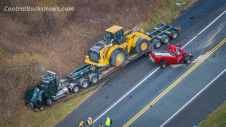 The year’s most-read CentralBucksNow story centered on a deadly head-on collision involving a pickup truck and a construction tractor-trailer hauling a CAT loader. The sheer scale of the crash and its fatal outcome drove sustained readership and community reaction.