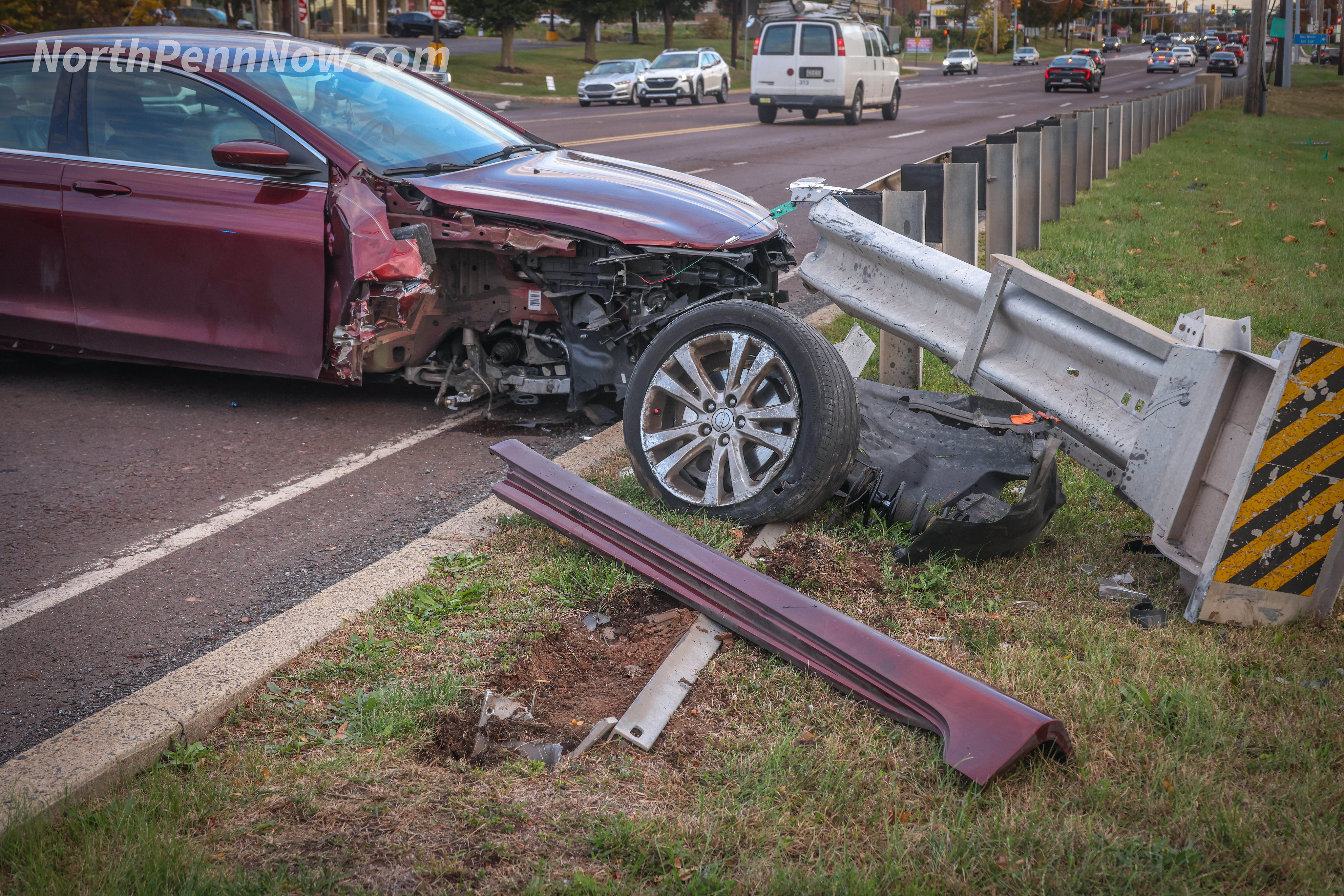 A driver of a maroon sedan crashed into a guardrail along southbound Bethlehem Pike/Route 309 in Hatfield Township Wednesday evening, affecting rush hour traffic on the busy pike.