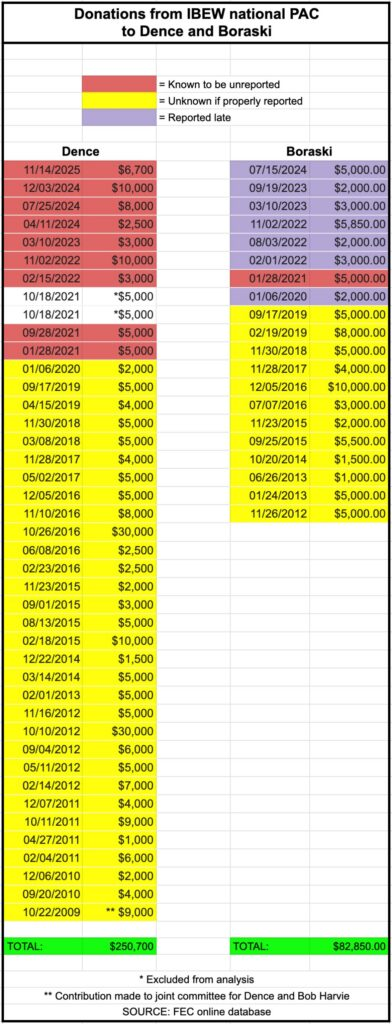 Despite those omissions becoming public knowledge in 2024, the federal IBEW PAC gave Dence $10,000 more in December of that year and another $6,700 in November 2025. Just as he hasn’t reported this money as it comes in, he hasn’t described how he spends it, leaving the public in the dark about how he has benefitted from it.