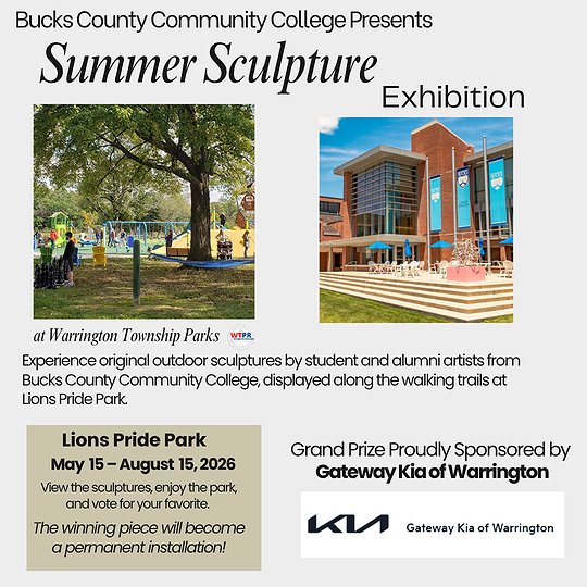 “This outdoor exhibition will feature student and alumni artwork … and will include an opportunity for the community to vote on one sculpture to become a permanent installation in the park,” said Alanna Moore, communications specialist for Warrington Township. “It’s a great way to bring public art into the community and get residents involved.”