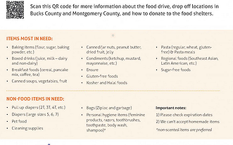 Residents are encouraged to donate non-perishable food items and essential household goods during the collection period. Most-needed food items include cereal, pasta, canned soups, fruits and vegetables, peanut butter, baking supplies, boxed beverages such as juice and milk, and culturally specific or dietary foods such as gluten-free, kosher or halal options. Non-food items in demand include diapers in sizes 5 through 7 and pull-ups, pet food, cleaning supplies, storage bags and personal hygiene products such as toothbrushes, toothpaste, soap and shampoo.