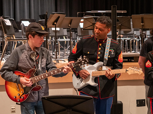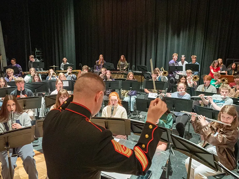 Marine musicians worked directly with Pennridge’s jazz ensemble, guiding students through improvisational solos during a performance of Stevie Wonder’s “Isn’t She Lovely.” The experience continued as the full concert band took the stage, where Gunnery Sergeant Malone conducted while Marine musicians performed alongside students in preparation for their upcoming Spring Concert on May 13.