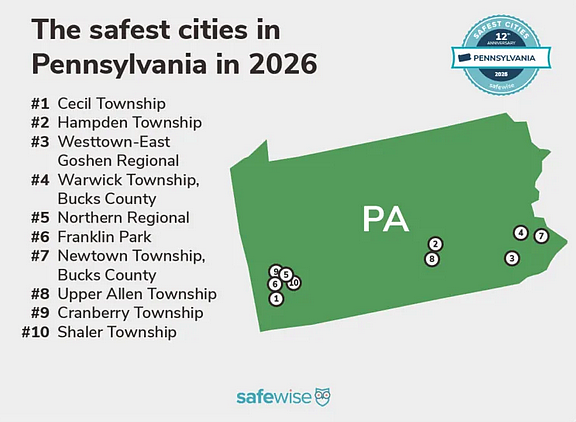 Warwick Township in Bucks County has been recognized as one of the safest communities in Pennsylvania for 2026, ranking near the top of a new statewide list compiled by SafeWise based on FBI crime data.