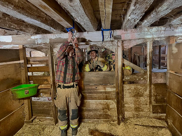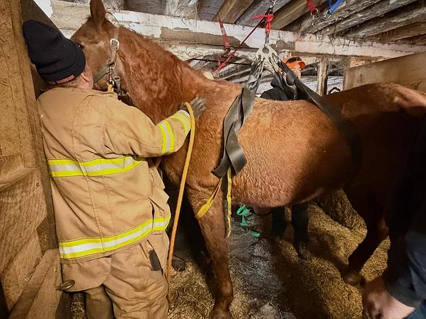 Firefighters used joists inside the barn and secured straps around the horse’s abdomen to carefully hoist Snickers back to his feet.