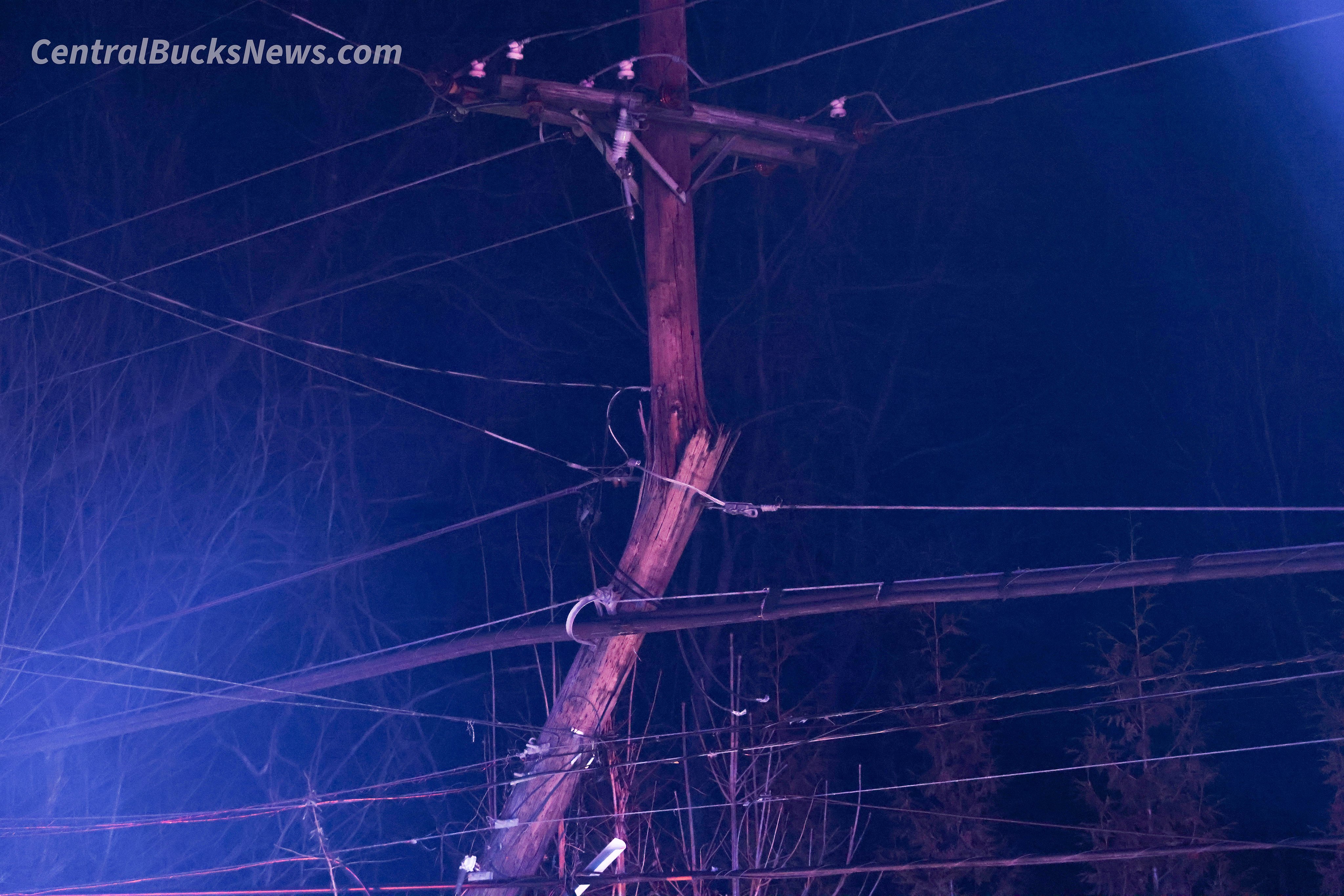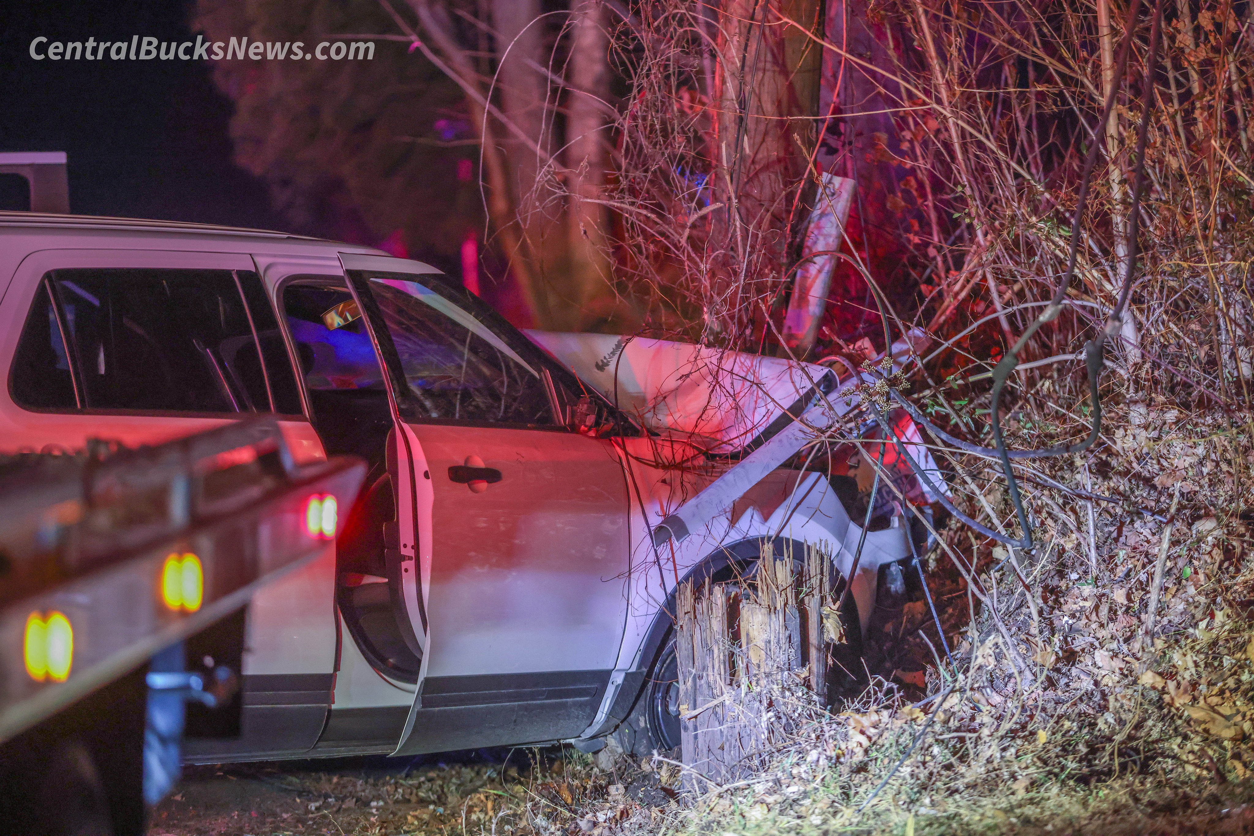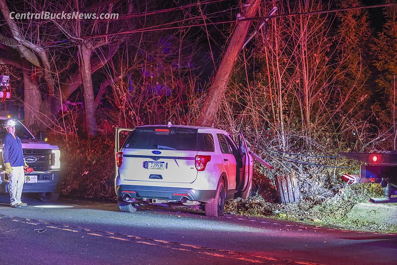 Police from Central Bucks Regional Police Department and Buckingham Township Police Department were dispatched to the scene between Creek Drive and Maple Avenue after a white Ford SUV left the roadway and struck a utility pole, bringing down power lines. The SUV bore a Pennsylvania municipal government license plate.