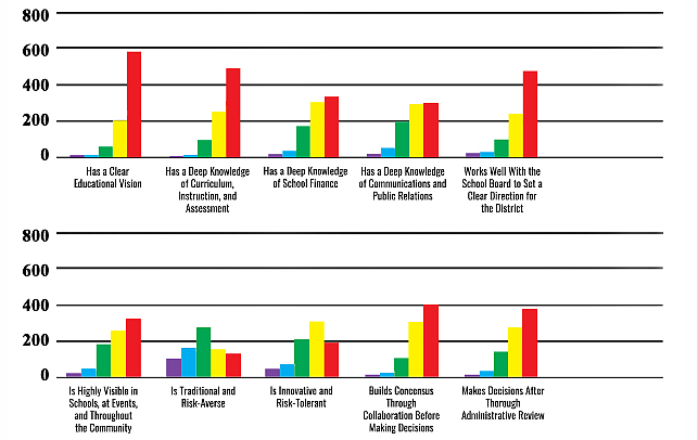 Respondents also weighed in on the qualities they want in the next superintendent. The strongest support clustered around leadership that student- and safety-centered, equipped with a clear educational vision, able to work with the school board to set a clear direction, and knowledgeable in curriculum, instruction, and assessment.